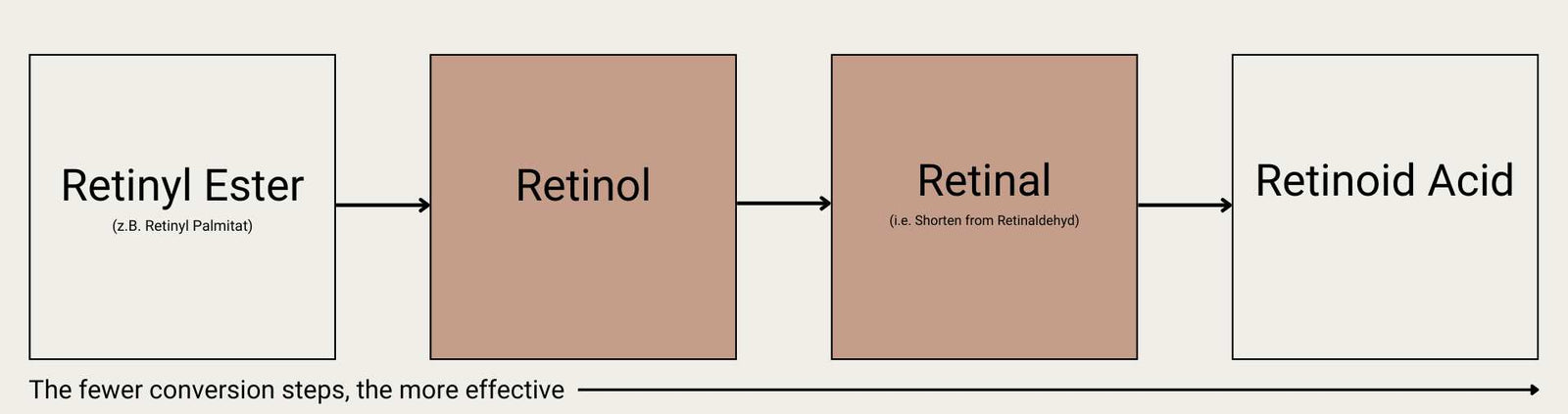 Retinal und Retinol sind beide Formen von Vitamin A. Auf den ersten Blick könnte man meinen, das 'a' in Retinal sei ein Tippfehler – doch weit gefehlt! Tatsächlich ist Retinal ein eigenständiger Wirkstoff mit seinen eigenen Eigenschaften. In unserem Diagramm kannst du die verschiedenen Formen und ihre Umwandlungsschritte entdecken. Eine einfache Faustregel: Je näher ein Wirkstoff an Retinsäure liegt, desto effektiver ist seine Wirkung.